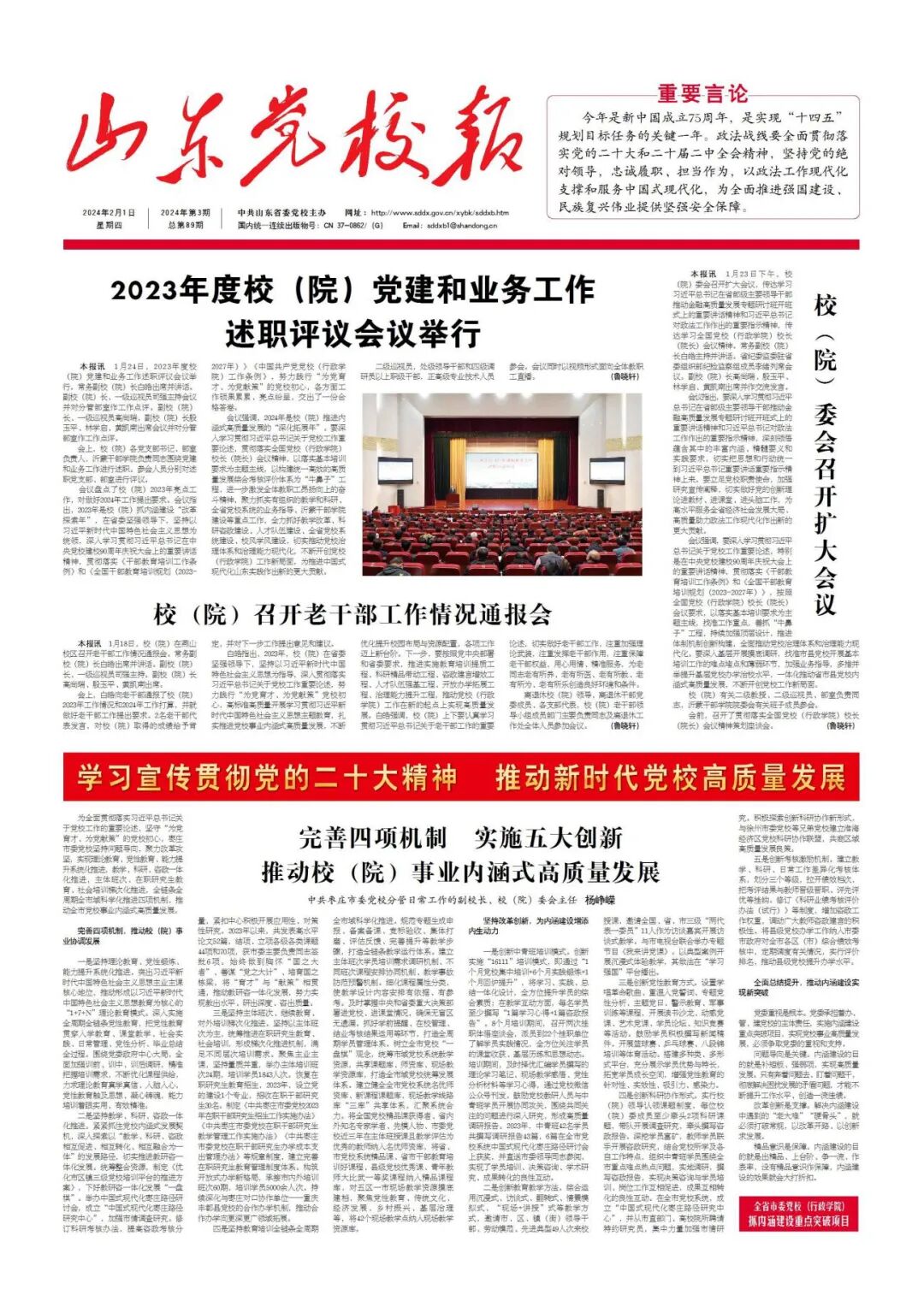 2月1日,《山东党校报》刊发我校内涵建设典型做法——《完善四项机制 实施五大创新 推动校(院)事业内涵式高质量发展》。在山东省委党校(山东行政学院)开展的2023年度市委党校(行政学院)常务副校(院)长抓内涵建设重点突破项目评审中,我校内涵建设重点突破项目通过结项评审,被评定为优秀等次。