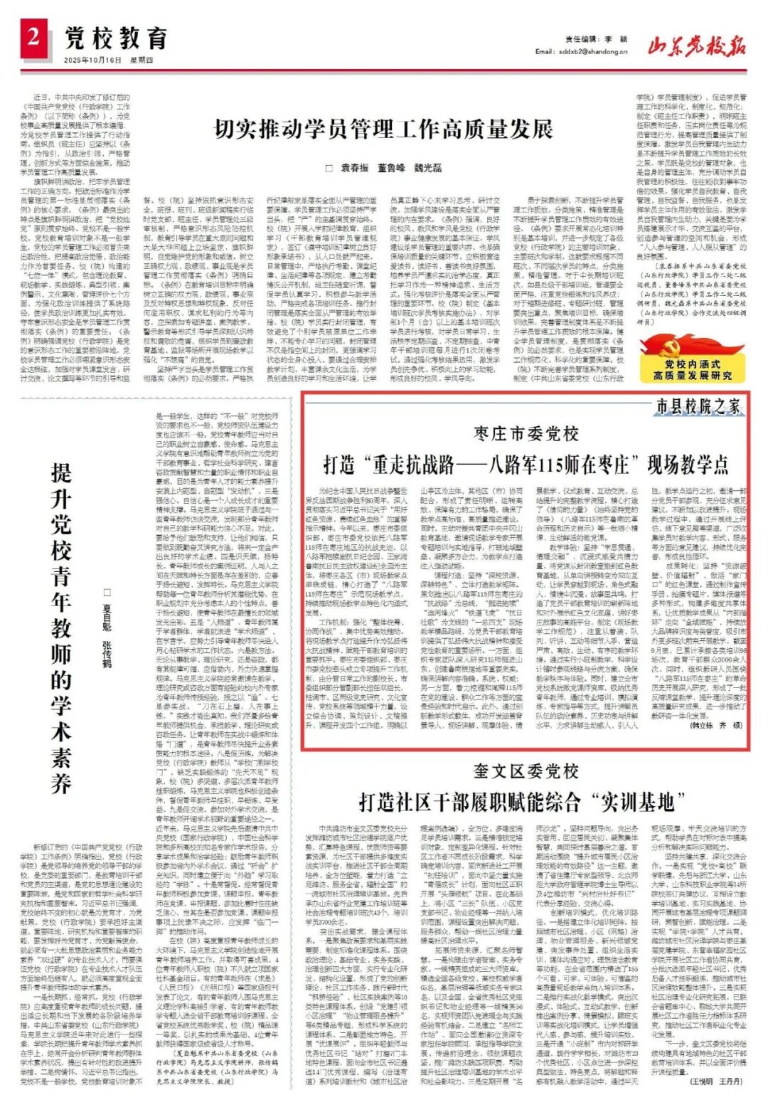 近日,《山东党校报》总第126期二版以《枣庄市委党校打造“重走抗战路——八路军115师在枣庄”现场教学点》为题,刊发我校联合市委组织部打造红色教育阵地的经验做法。文章聚焦纪念抗战胜利80周年核心主题,通过展示“串珠成链”整合抱犊崮、王家湾等抗战史迹、构建“一总四支”教学矩阵、创新沉浸式教学模式的实践成效,凸显了此示范现场教学点作为干部教育培训阵地与红色文化展示平台的双重价值。全文如下: